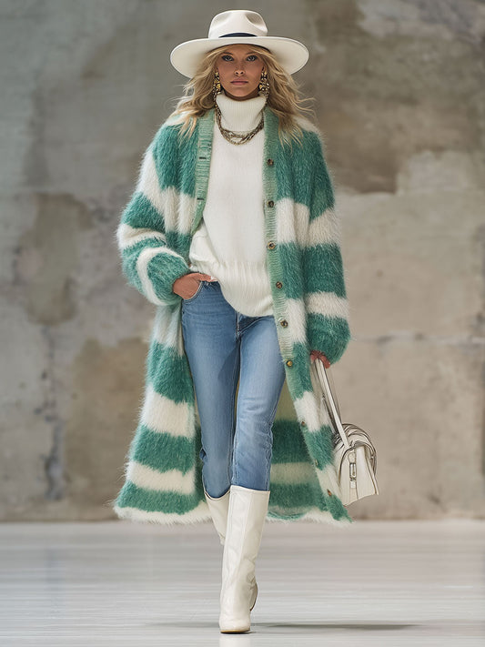 Vintage Vert et Blanc en Mohair : Cardigan Tricoté Élégant