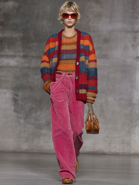 Cardigan Retro en Tricot à Rayures Arc-en-Ciel avec Boutons